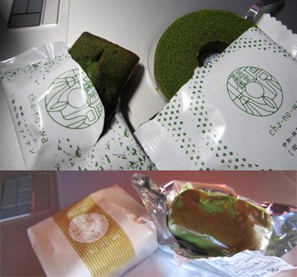 お茶屋さんで買った 抹茶のフィナンシェ・バームクーヘン・スフレ・ほうじ茶のスフレ。